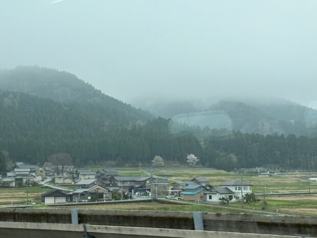 Natuurlijk vertrok de trein stipt op tijd en al snel zoefden we door een vrij mistig landschap. Mijn zonnebril bleef natuurlijk op, want ‘ervaren reiziger’.